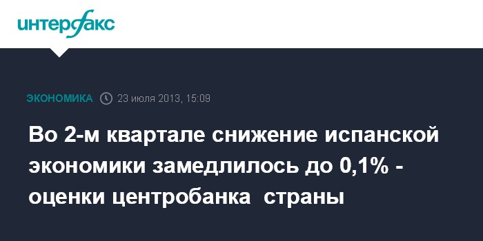 23 июля. FINMARKET.RU - Во 2-м квартале этого года сокращение ВВП Испании, вероятно, замедлилось до 0,1% по сравнению с 1-м кварталом, когда наблюдалось падение на 0,5%, объявил сегодня центральный банк страны.