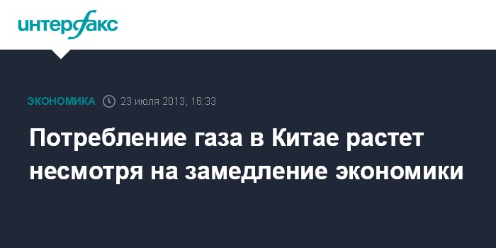 Пекин. 23 июля. INTERFAX.RU - Основные показатели газового рынка Китая оставались на высоком уровне в течение первого полугодия 2013 года, несмотря на замедление темпов роста ВВП во второй крупнейшей экономике мира до минимального уровня за почти четверть века.