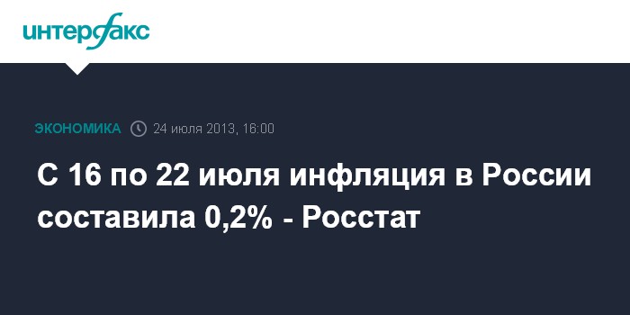 24 июля. FINMARKET.RU - За период с 16 по 22 июля 2013 года инфляция в России составила 0,2%, с начала июля - 0,8%, сообщает Федеральная служба госстатистики (Росстат). Потребительские цены с начала года выросли на 4,3%.