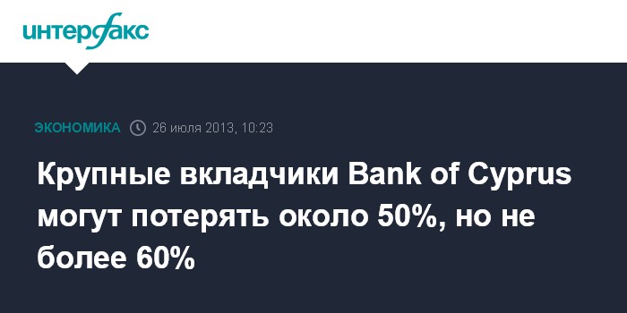 26 июля. FINMARKET.RU - Глава крупнейшей кредитной организации Кипра - Bank of Cyprus - Софоклис Михаелидис считает, что потери крупных вкладчиков банка составят, с учетом проведенной оценки потребностей банка в капитале, около 50%, но не более 60%. Об этом он заявил в интервью RIK TV.