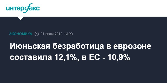 31 июля. FINMARKET.RU - Безработица в 17 странах еврозоны в июне 2013 года составила 12,1%, что совпало с пересмотренным майским значением, свидетельствуют данные Статистического управления Евросоюза.