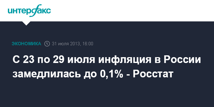 31 июля. FINMARKET.RU - За период с 23 по 29 июля 2013 года инфляция в России составила 0,1%, с начала июля - 0,8%, сообщает Федеральная служба госстатистики (Росстат). Потребительские цены с начала года выросли на 4,4%.