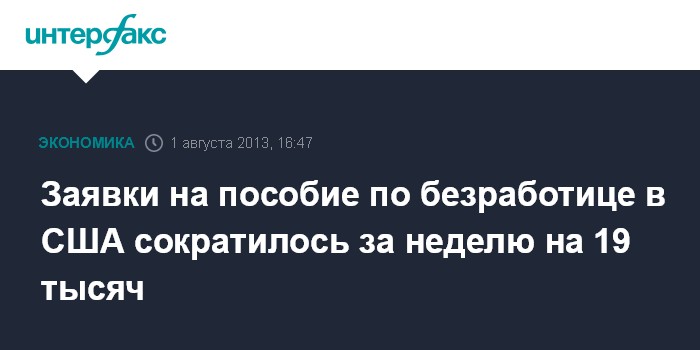 1 августа. FINMARKET.RU - Число американцев, впервые обратившихся за пособием по безработице, на прошлой неделе сократилось на 19 тыс. - до 326 тыс., минимального уровня с января 2008 года, говорится в отчете Минтруда США.