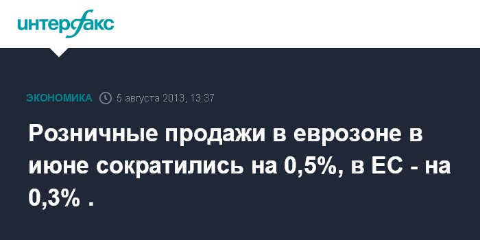 5 августа. FINMARKET.RU - В июне 2013 года розничные продажи в еврозоне снизились на 0,5% относительно предыдущего месяц, свидетельствуют данные Статистического управления Европейского союза (Eurostat).