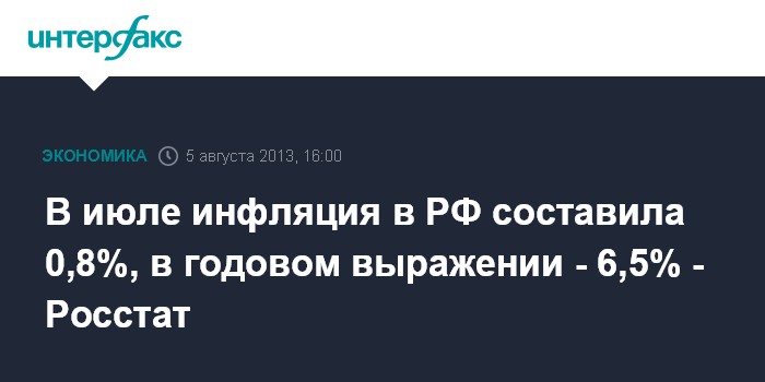 5 августа. FINMARKET.RU - В июле 2013 года инфляция в России ускорилась до 0,8% после 0,4% в июне, сообщает Федеральная служба госстатистики (Росстат). В мае инфляция составляла 0,7%, в апреле - 0,5%, в марте - 0,3%, в феврале - 0,6%, в январе - 1%.