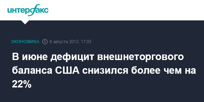 6 августа. FINMARKET.RU - В июне 2013 года дефицит внешнеторгового баланса США упал на 22,4% - до $34,2 млрд, минимального значения с октября 2009 года, свидетельствует обнародованный во вторник отчет Минторга страны.