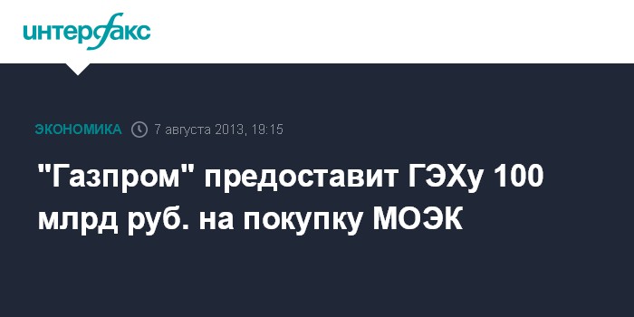 "Газпром" предоставит ГЭХу 100 млрд руб. на покупку МОЭК