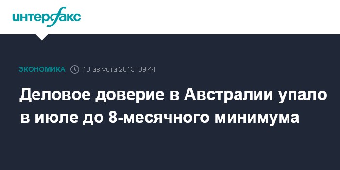 13 августа. FINMARKET.RU - В июле уровень делового доверия в Австралии опустился до самой низкой отметки за последние 8 месяцев, поскольку сокращение спроса на сырье со стороны КНР сгущает тучи над экономикой страны, сильно зависящей от китайского экспорта, отмечает MarketWatch.