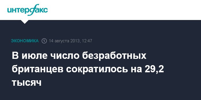 Снижение количества безработных в прошлом месяце продолжилось 9-й месяц подряд, в июне и июле оно было наиболее значительным с марта 2010 года, когда падение составляло 30,4 тыс., и стало еще одним свидетельством усилившегося восстановления британской экономики.