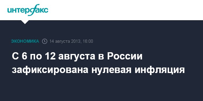14 августа. FINMARKET.RU - За период с 6 по 12 августа 2013 года в России зафиксирована нулевая инфляция, сообщает Федеральная служба госстатистики (Росстат). С начала августа рост потребительских цен составил 0,1%, с начала года - 4,5%.