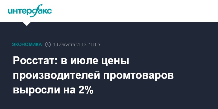 16 августа. FINMARKET.RU - В июле 2013 года цены производителей промышленных товаров, по предварительным данным, выросли на 2%, после роста на 0,4% в мае, сообщает Федеральная служба госстатистики (Росстат).