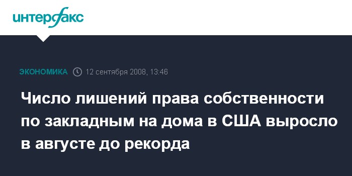 Москва. 12 сентября. INTERFAX.RU - Число случаев лишения прав собственности по закладным на дома в США выросло в августе до рекордного уровня, сообщило агентство Bloomberg со ссылкой на данные компании RealtyTrac.