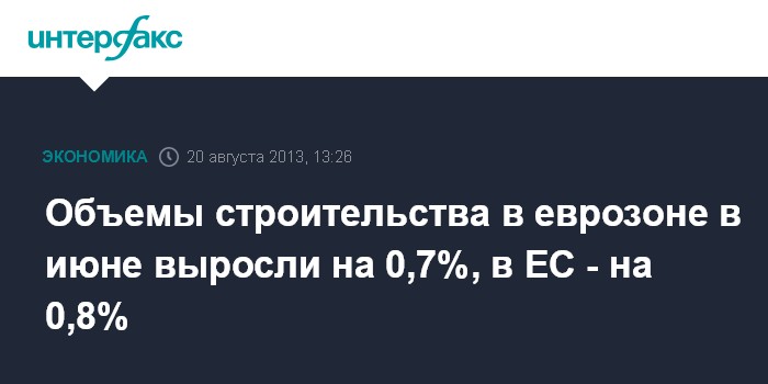 20 августа. FINMARKET.RU - Объем строительства в еврозоне в июне 2013 года вырос на 0,7% по сравнению с предыдущим месяцем, свидетельствуют данные Статистического управления Европейского союза (Евростата). Падение объемов строительства относительно июня 2012 года составило 3%.