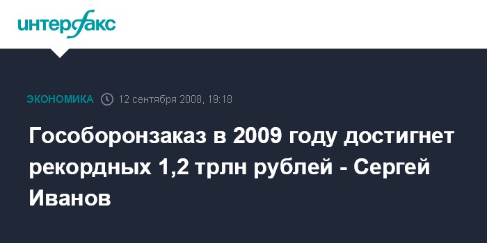 "У нас объем гособоронзаказа в целом на будущий год запланирован на рекордно высокой отметке - в 1,2 трлн рублей", - заявил С.Иванов в ходе рабочей встречи с премьер-министром РФ Владимиром Путиным в пятницу.