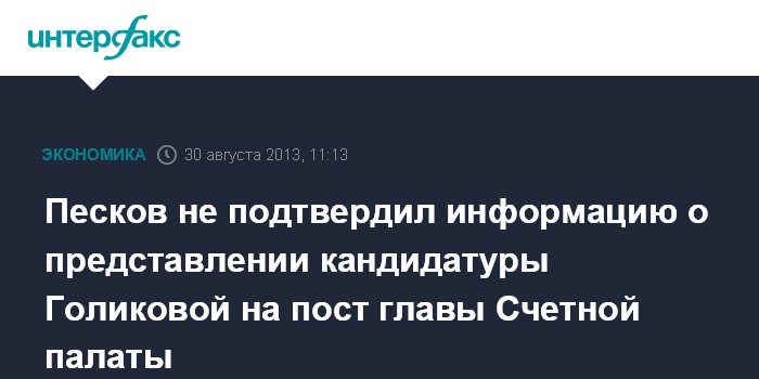 30 августа. FINMARKET.RU - Пресс-секретарь президента РФ Дмитрий Песков не подтвердил информацию о том, что в Госдуму направлено представление президента на Татьяну Голикову для утверждения ее на посту главы Счетной палаты РФ.