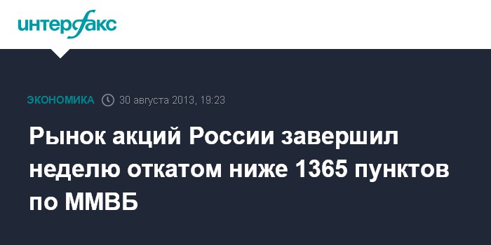 Москва. 30 августа. INTERFAX.RU - Российский рынок акций завершил неделю откатом ниже 1365 пунктов по индексу ММВБ в ожидании новостей о Сирии; продолжился рост акций "Роснефти", разогретых на неделе покупками со стороны главы компании Игоря Сечина, и рухнули на 7% акции "Ростелекома" в связи со скорым завершением обратного выкупа компанией собственных бумаг.