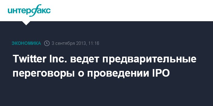 Нью-Йорк. 3 сентября. INTERFAX.RU - Twitter Inc. ведет предварительные переговоры с инвестбанками о проведении первичного размещения акций (IPO), сообщает агентство Bloomberg со ссылкой на источники, знакомые с ситуацией.