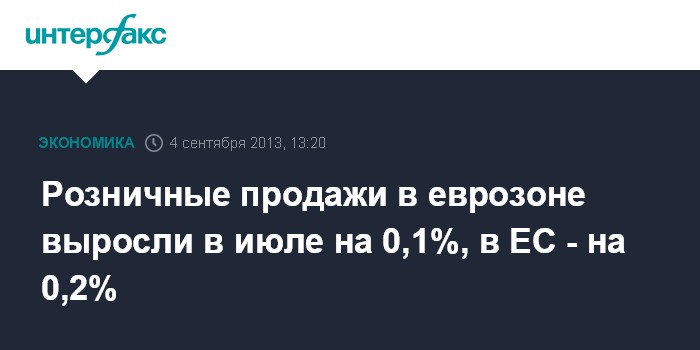 4 сентября. FINMARKET.RU - В июле 2013 г. розничные продажи в еврозоне выросли на 0,1% относительно предыдущего месяц, свидетельствуют данные Статистического управления Европейского союза (Eurostat).
