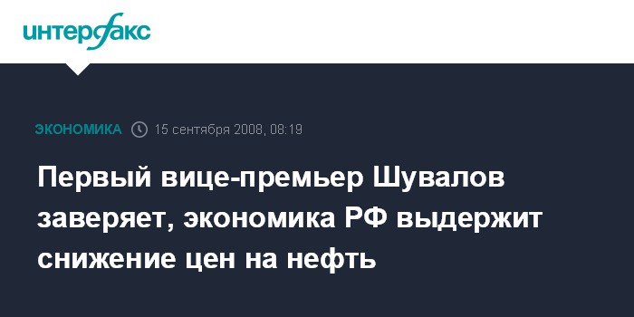 Москва. 15 сентября. INTERFAX.RU - Российская экономика накопила достаточный запас прочности и готова выдержать снижение цен на нефть на мировых рынках, заявил первый вице-премьер РФ Игорь Шувалов.