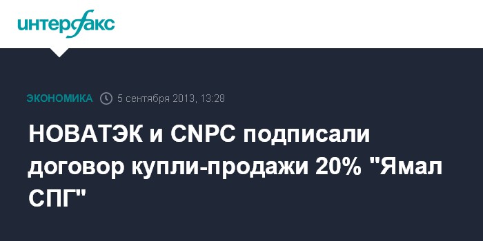 Санкт-Петербург. 5 сентября. INTERFAX.RU - ОАО "НОВАТЭК" и CNPC подписали договор купли-продажи акций ОАО "Ямал СПГ", передал корреспондент "Интерфакса" с церемонии подписания на полях саммита G20.