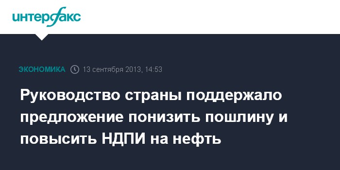 Нижний Новгород. 13 сентября. INTERFAX.RU - Предложение поэтапно, в течение трех лет, провести снижение экспортной пошлины на нефть и одновременно повышение НДПИ на нефть принципиально поддержано на совещаниях у президента Владимира Путина и премьер-министра РФ Дмитрия Медведева.