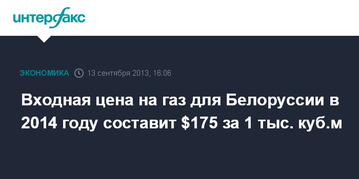 Минск. 13 сентября. INTERFAX.RU - Белоруссия в 2014 г. будет получать российский газ по цене $175 за 1 тыс.куб.м., сообщил первый вице-премьер республики Владимир Семашко.