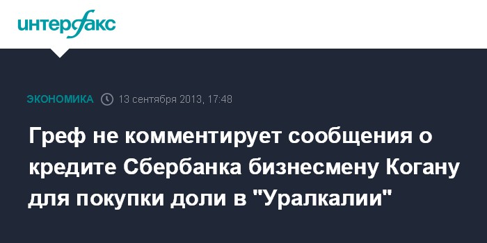 Минск. 13 сентября. INTERFAX.RU - Глава Сбербанка РФ Герман Греф отказывается комментировать появившуюся в СМИ информацию о предоставлении кредита российскому бизнесмену Владимиру Когану для покупки части активов ОАО "Уралкалий".