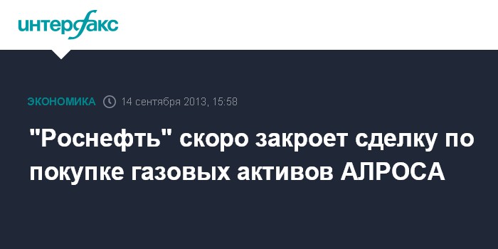 Сочи. 14 сентября. INTERFAX.RU - "Роснефть" может закрыть сделку по покупке газовых активов компании АЛРОСА в ближайшее время, заявил глава компании Игорь Сечин.