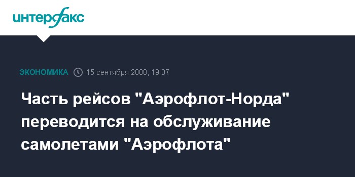 Москва. 15 сентября. INTERFAX.RU – Часть рейсов авиакомпании "Аэрофлот - российские авиалинии", ранее выполнявшиеся на самолетах авиакомпании "Аэрофлот-Hорд", с понедельника переводятся на обслуживание парком "Аэрофлота", говорится в сообщении перевозчика.