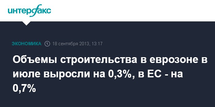 18 сентября. FINMARKET.RU - Объем строительства в еврозоне в июле 2013 года вырос на 0,3% по сравнению с предыдущим месяцем, свидетельствуют данные Статистического управления Европейского союза (Евростата). Падение объемов строительства относительно июля 2012 года составило 1,2%.
