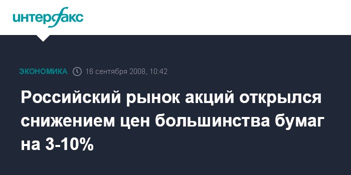Российский рынок акций открылся снижением цен большинства бумаг на 3-10%