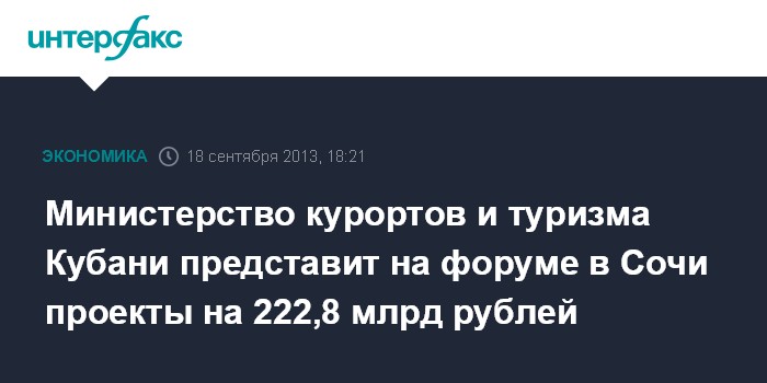 Краснодар. 19 сентября. INTERFAX.RU - Министерство курортов и туризма Краснодарского края представит на инвестиционном форуме в Сочи 84 проекта с общим объемом финансирования 222,8 млрд рублей.