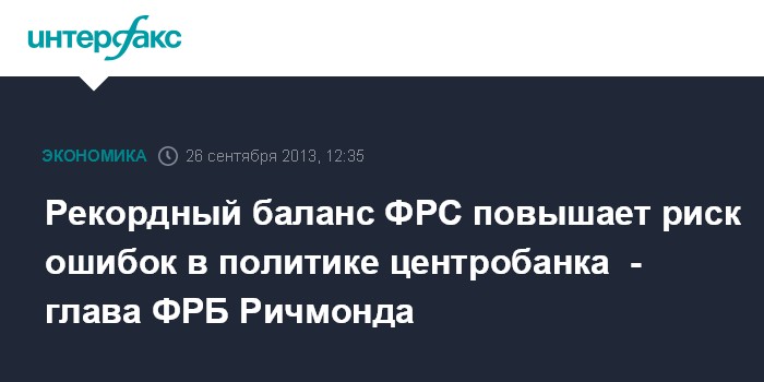 26 сентября. FINMARKET.RU - Глава Федерального резервного банка (ФРБ) Ричмонда Джеффри Лэкер считает, что огромный баланс Федеральной резервной системы (ФРС) одновременно с политикой прогнозирования вероятного направления изменения процентных ставок повышают риски ошибок в политике ЦБ и потенциальную стоимость таких ошибок.