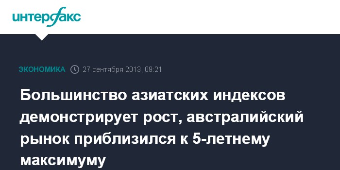 27 сентября. FINMARKET.RU - Сегодня большинство фондовых индексов Азиатско-Тихоокеанского региона демонстрирует рост, причем австралийский рынок вплотную приблизился к максимуму за 5 лет, сообщает Bloomberg.