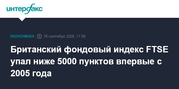 Лондон. 16 сентября. INTERFAX.RU - Британский фондовый индекс FTSE 100 упал в ходе торгов во вторник ниже отметки 5000 пунктов впервые с июня 2005 года, сообщает агентство Bloomberg.