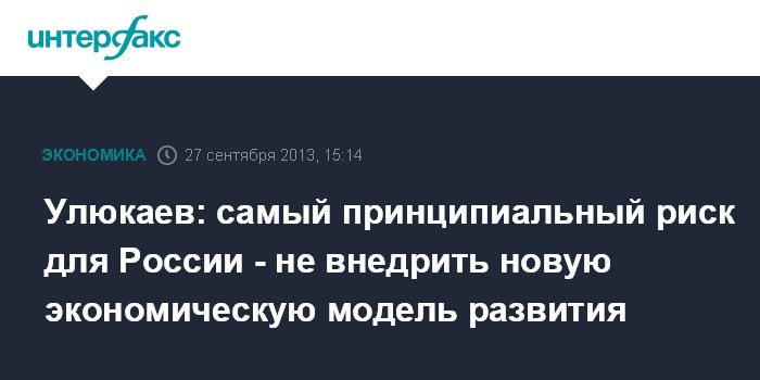 27 сентября. INTERFAX.RU - Министр экономического развития Алексей Улюкаев, выступая на инвестфоруме в Сочи, заявил, что наряду с внешними и внутренними рисками, которые могут так или иначе повлиять на темпы роста российской экономики, существует "самый принципиальный риск - это риск того, что мы не внедрим ту новую экономическую модель развития".
