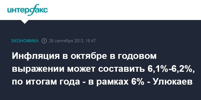"Про октябрь. Думаю, что по итогам октября будет точно не больше, чем 6,2%, может быть 6,1%", - сказал А.Улюкаев на брифинге в рамках инвестиционного форума Сочи-2013.