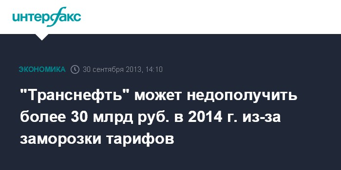 Москва. 30 сентября. INTERFAX.RU - "Транснефть" может недополучить более 30 млрд рублей выручки в 2014 г. в случае заморозки тарифов, сообщил журналистам первый вице-президент компании Максим Гришанин.