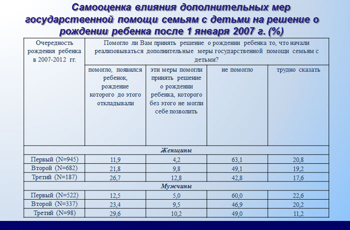 По результатам первого обследования репродуктивных планов населения в октябре 2012 года (было опрошено 10 тыс. респондентов в 30 субъектах РФ; женщины в возрасте 18 - 44 лет, мужчины – 18 - 60 лет) выяснилось: