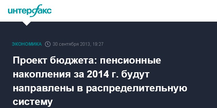Москва. 30 сентября. INTERFAX.RU - Пенсионные накопления граждан России за 2014 г. будут направлены в распределительную систему. Такая информация содержится в пояснительной записке к проекту федерального бюджета на 2014-2016 гг., размещенной на официальном сайте Госдумы.
