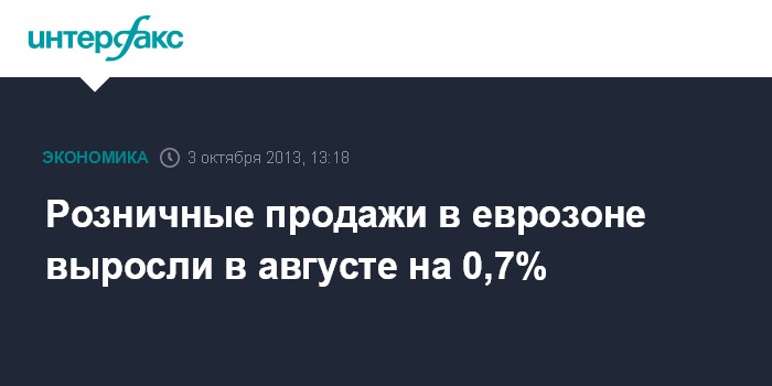 3 октября. FINMARKET.RU - В августе 2013 года розничные продажи в еврозоне выросли на 0,7% относительно предыдущего месяца, продемонстрировав самый значительный подъем с мая, свидетельствуют данные Статистического управления Европейского союза (Eurostat).