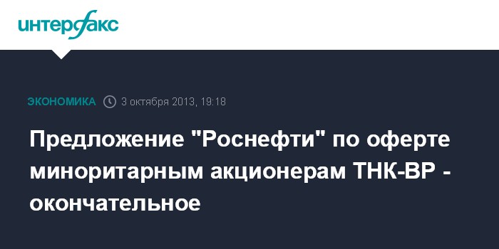 Предложение "Роснефти" по оферте миноритарным акционерам ТНК-ВР - окончательное