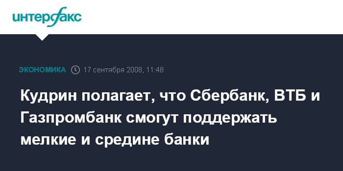 "Мы, по сути, рассчитываем, что Сбербанк, ВТБ и Газпромбанк - как банки, которые являются системообразующими - смогут прокредитовать мелкие и средние банки", - сказал в эфире телеканала "Вести 24" вице-премьер и министр финансов РФ Алексей Кудрин.