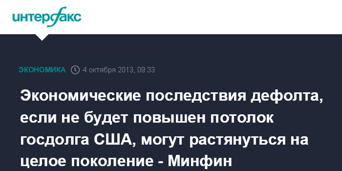 4 октября. FINMARKET.RU - В министерстве финансов США считают, что экономические последствия дефолта правительства США, который произойдет, если не будет повышен потолок госдолга, будут не просто глубокими, но могут растянуться на десятилетия. Эти последствия, включая повышение процентных ставок, сокращение инвестиций, увеличение долговой нагрузки, а также ослабление роста экономики, могут растянуться на целое поколение, говорится в отчете американского Минфина.