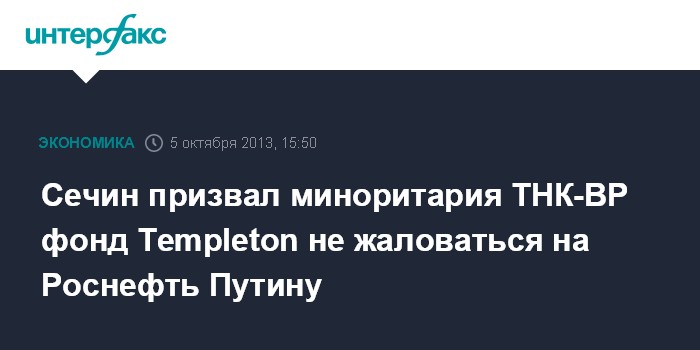 Сечин призвал миноритария ТНК-BP фонд Templeton не жаловаться на Роснефть Путину