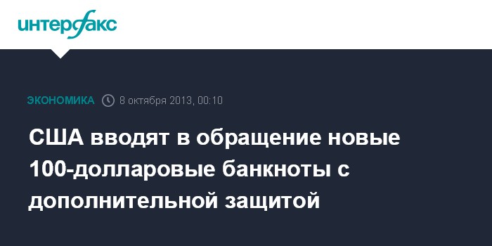 Вашингтон. 8 октября. INTERFAX.RU - Новая купюра достоинством $100 начнет обращение в США с 8 октября 2013 года.