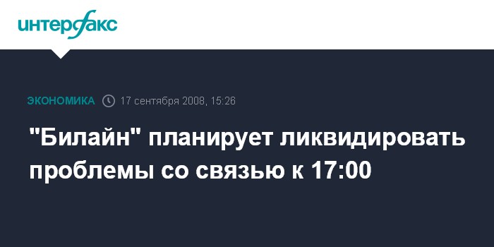 Москва. 17 сентября. INTERFAX.RU - Технические проблемы, связанные с аварией на подсистеме коммутации, должны ликвидировать через два часа, сообщила "Интерфаксу" пресс-секретарь компании "Вымпелком" Екатерина Осадчая в среду.