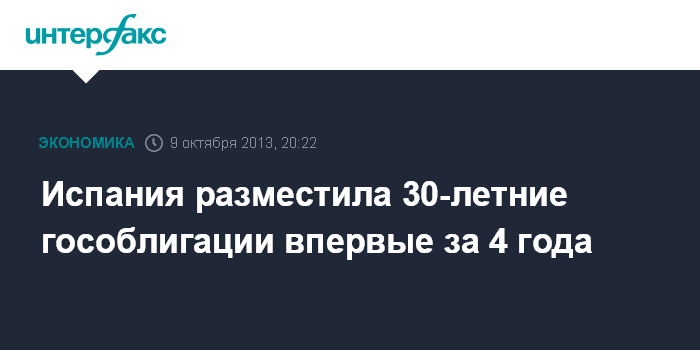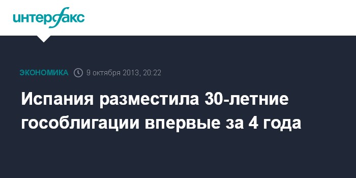 Мадрид. 9 октября. INTERFAX.RU - Правительство Испании в среду продало первые 30-летние гособлигации за четыре года, поскольку министерство финансов решило воспользоваться повышенным интересом инвесторов к долговым обязательствам европейской периферии, чтобы продлить срочность госдолга, пишет Financial Times.