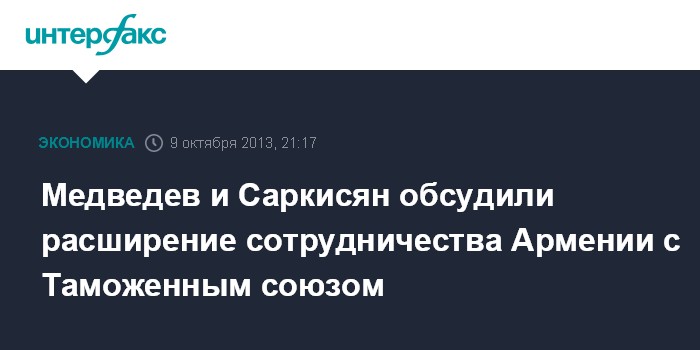 Москва. 9 октября. INTERFAX.RU - Премьер-министры России и Армении Дмитрий Медведев и Тигран Саркисян обсудили в ходе телефонного разговора расширение сотрудничества Еревана с Таможенным союзом, сообщает в среду пресс-служба кабинета министров России.