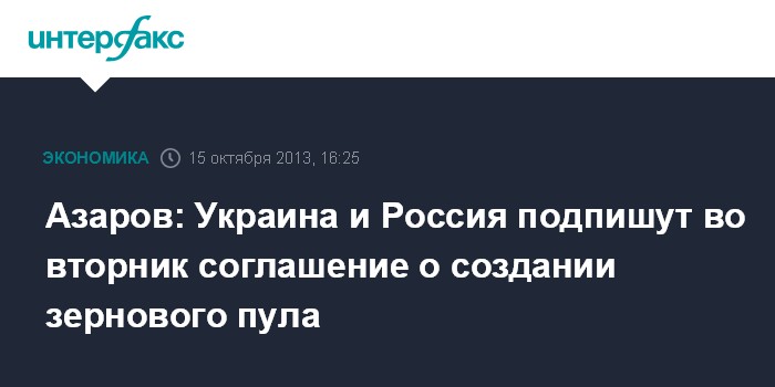 Калуга. 15 октября. INTERFAX.RU - Украина и Россия намерены подписать соглашение о создании зернового пула, сообщил премьер-министр Украины Николай Азаров.